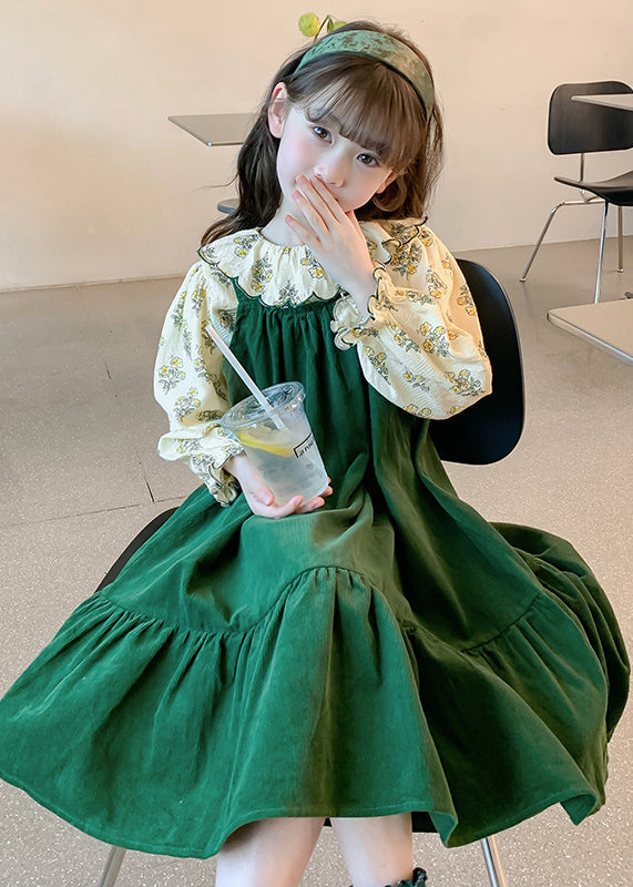 Boutique Blackish Green Print Wrinkled Cotton Baby Girls Dress Two Pieces Set Fall