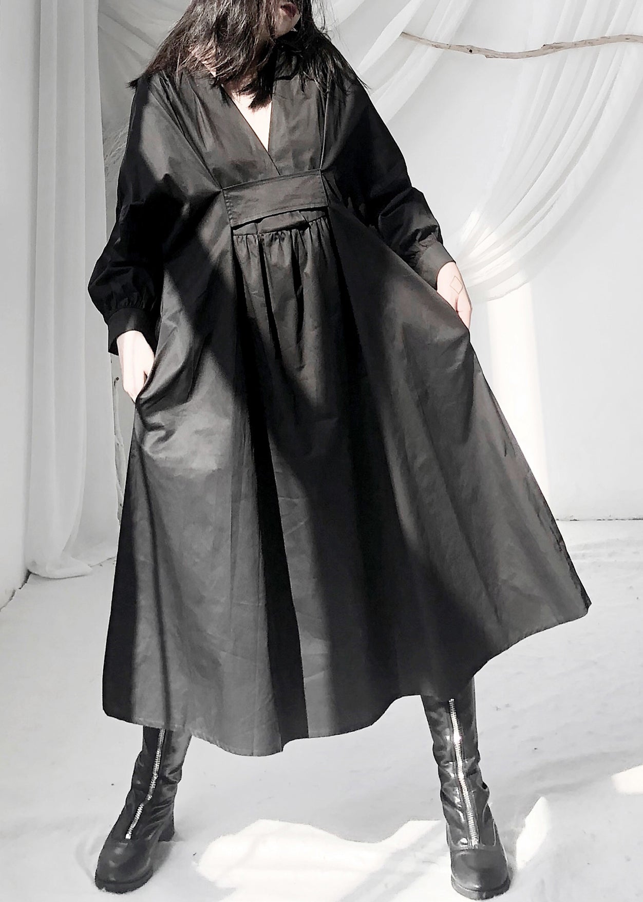 Casual Black V Neck Patchwork Wrinkled Maxi Dress Long Sleeve