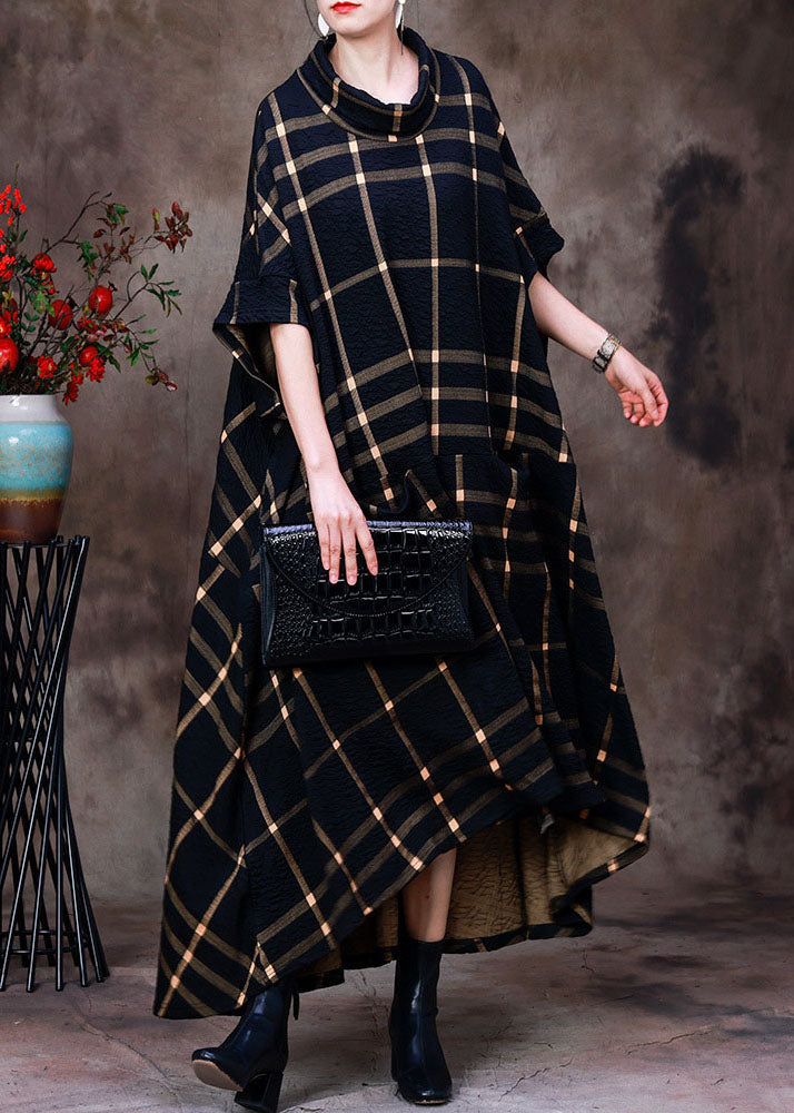 Casual Orange Stand Collar Plaid Cotton Holiday Dress Short Sleeve