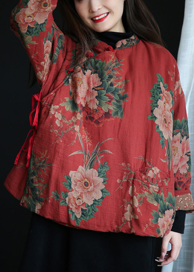 Casual Red Stand Collar Print Button Warm Fleece Cotton Parka Winter