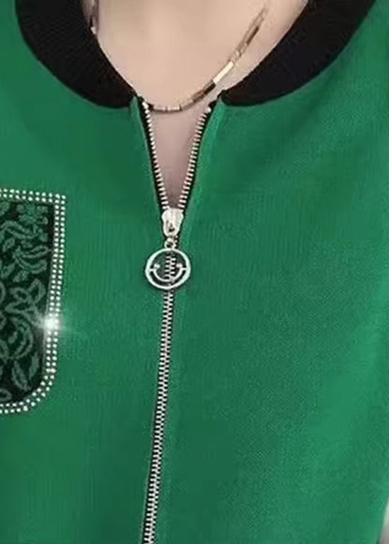 Chic Black Print Zircon Zip Up Patchwork Knit Coat Fall