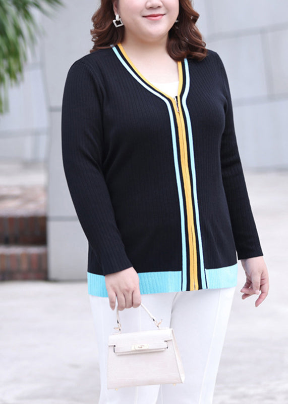Chic Black V Neck Zippered Striped Patchwork Knit Top Long Sleeve