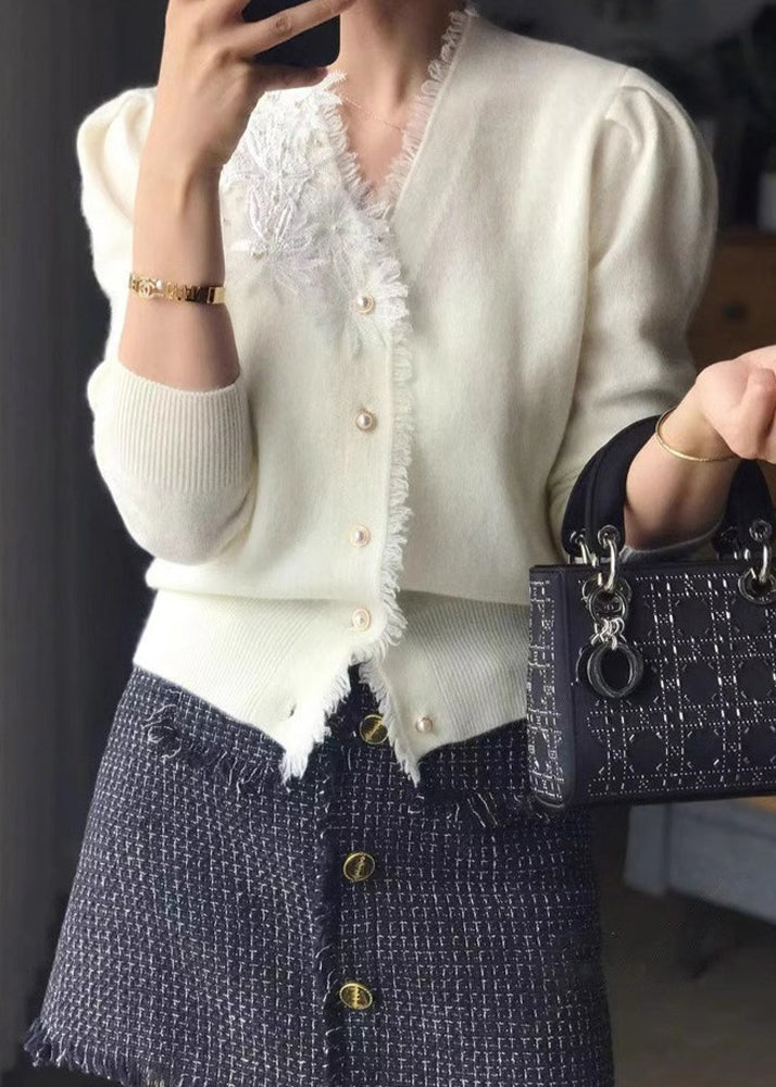 Chic White V Neck Tasseled Embroidered Woolen Cardigan Fall