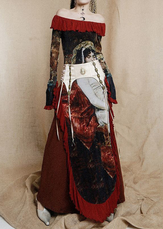 Chic Red Ruffled Print Cotton Maxi Dresses Long Sleeve