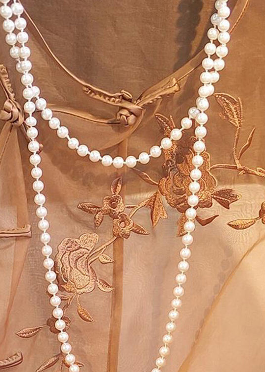 Chinese Style Light Brown Embroidered Tulle Shirt Top Summer