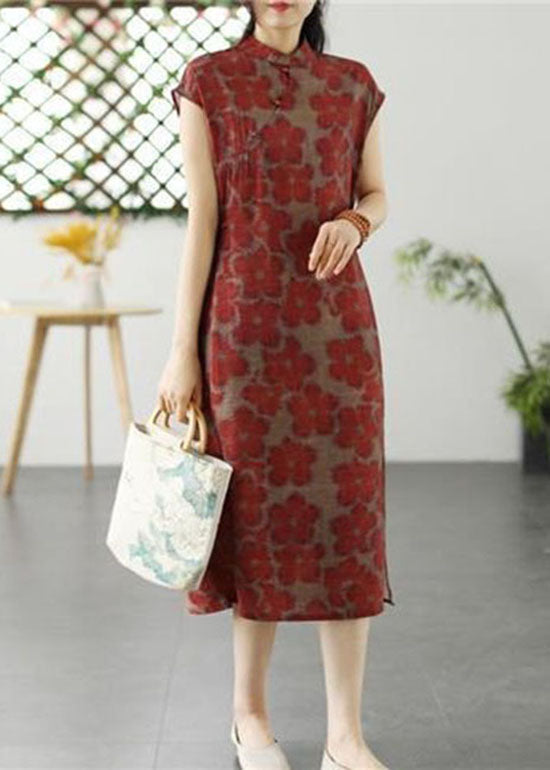 Chinese Style Red Stand Collar Print Patchwork Linen Dress Summer