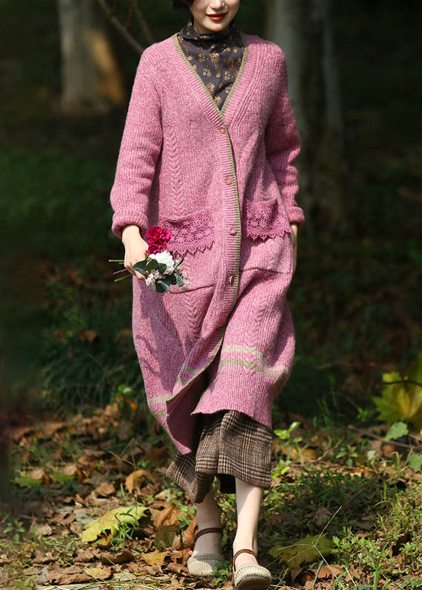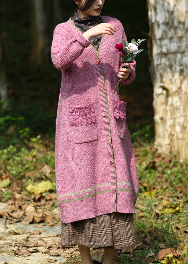 Classy Purple V Neck Button Patchwork Knitted Cotton Thread Long Cardigans Fall