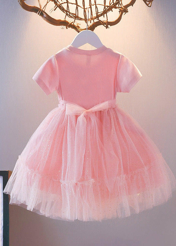 Cute Purple Patchwork Wrinkled Tulle Kids Long Dress Short Sleeve