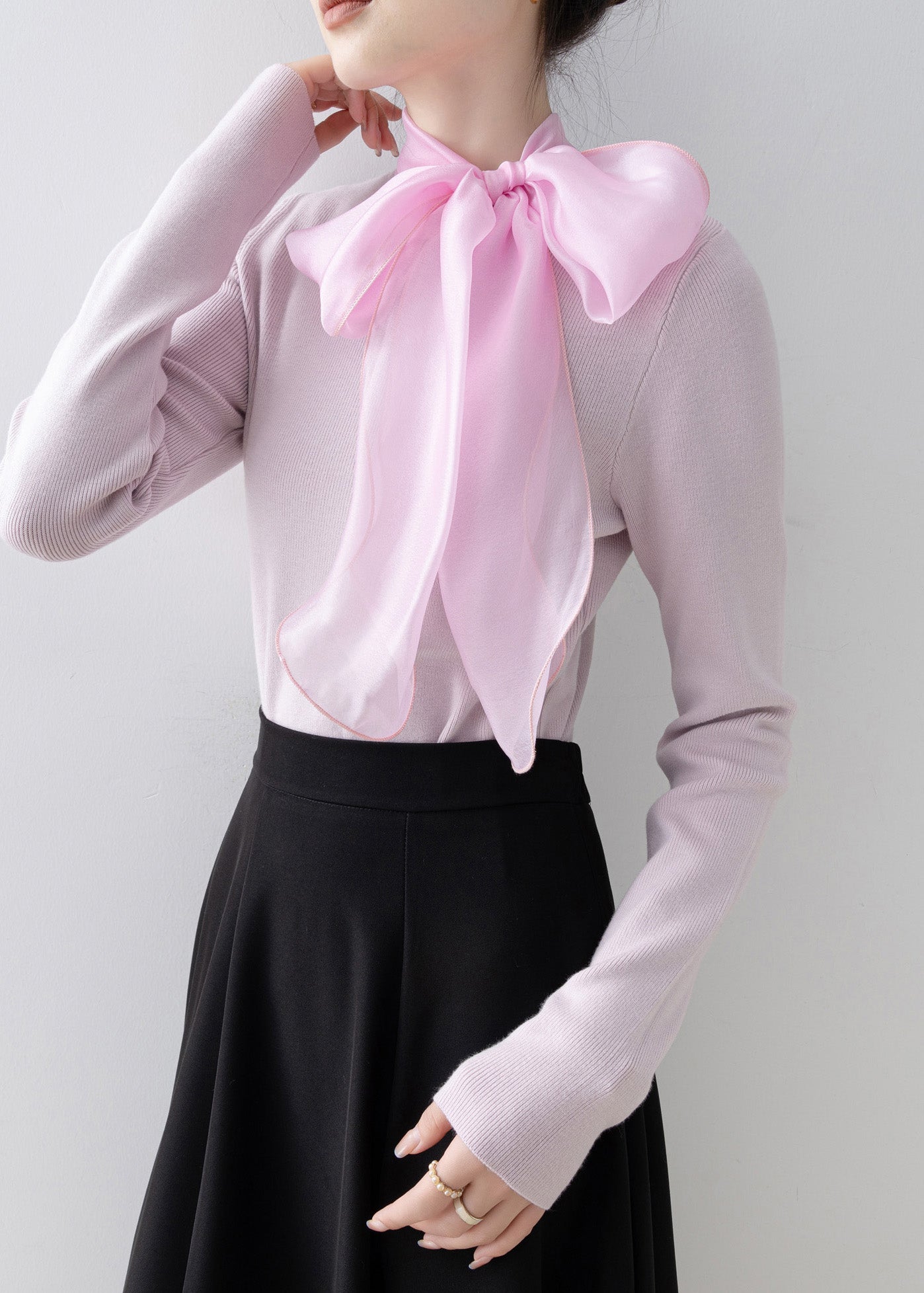 Elegant Pink Hign Neck Bow Slim Fit Knit Sweaters Spring