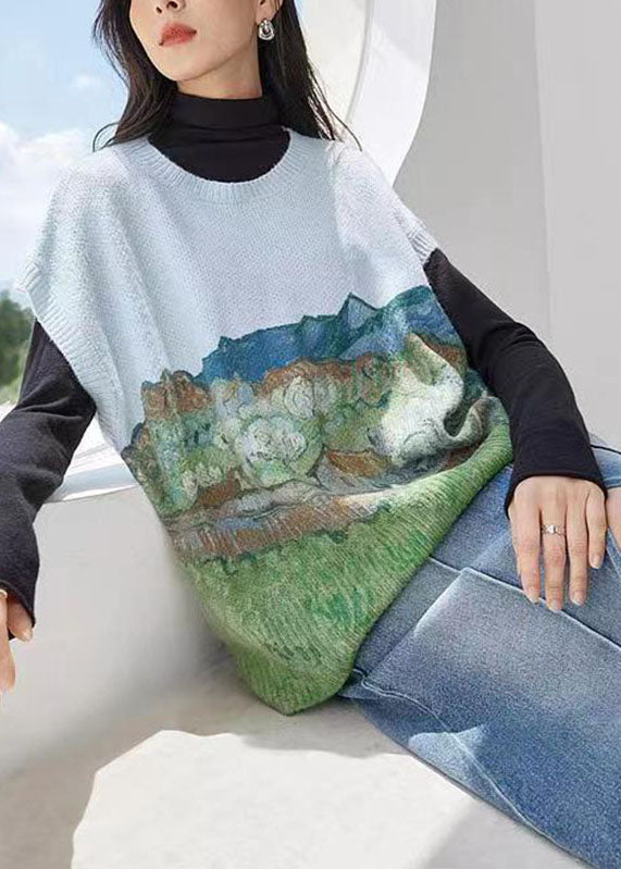 Fashion Blue Floral Cotton Knit Waistcoat Short Sleeve