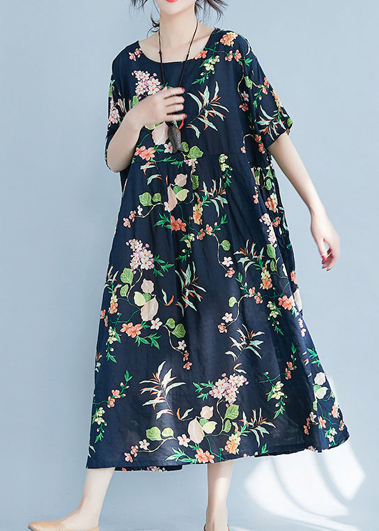 Fashion Navy O-Neck zippered Pocket Floral Print Dresses Short Sleeve