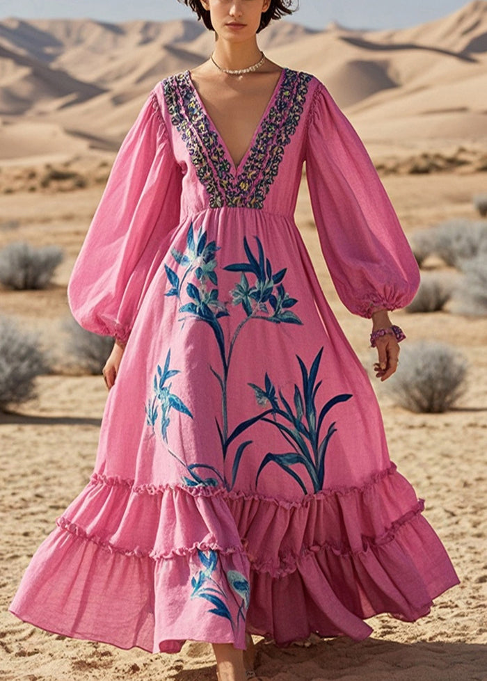 Fine Rose Ruffled Print Cotton Ankle Dress Fall