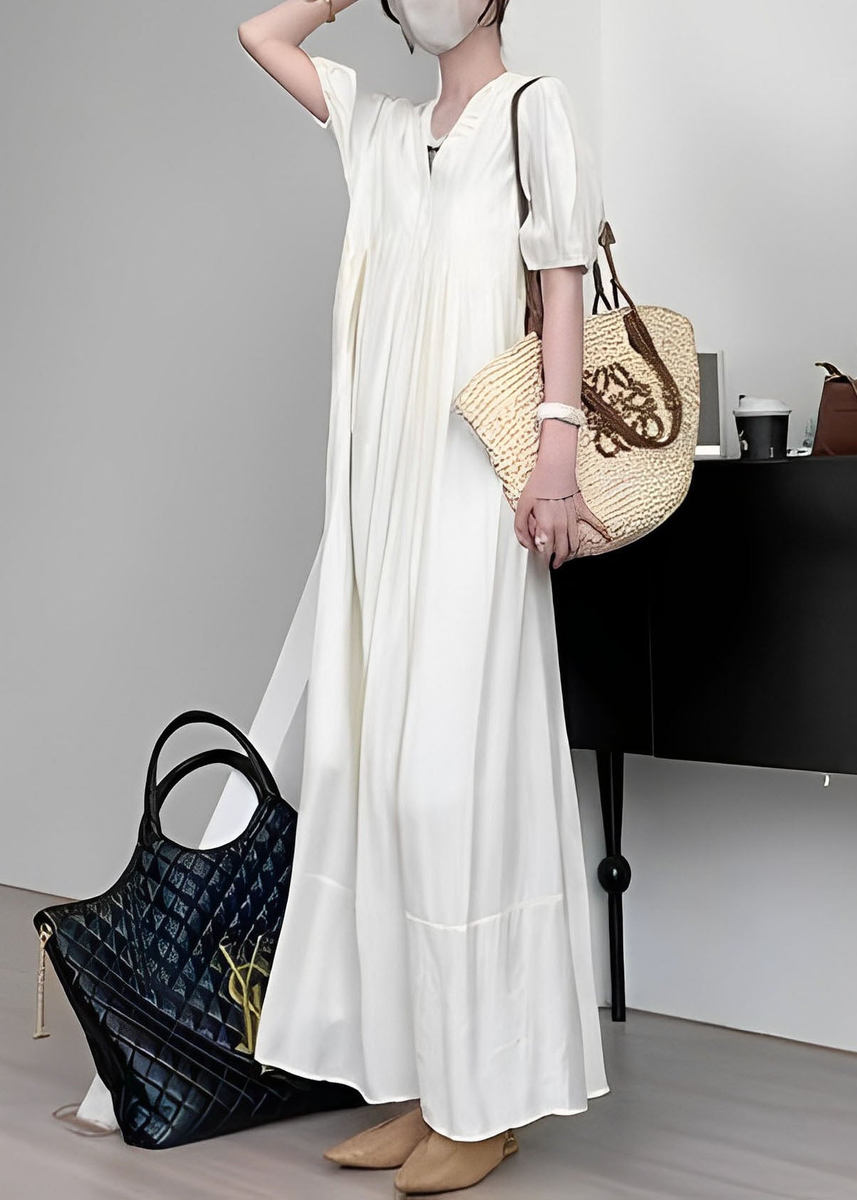 French Beige V Neck Patchwork Wrinkled Holiday Long Dress Short Sleeve