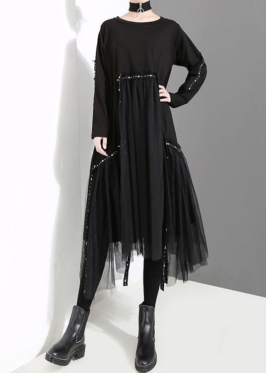 French Black O-Neck Asymmetrical Tulle Patchwork Long Dresses Spring