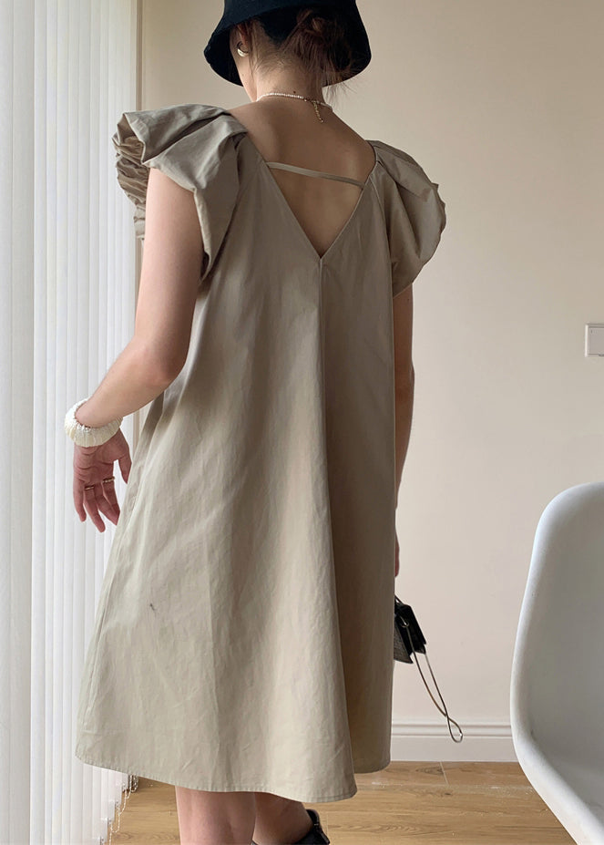 French Light Green V Neck Patchwork Cotton Dresses Butterfly Sleeve