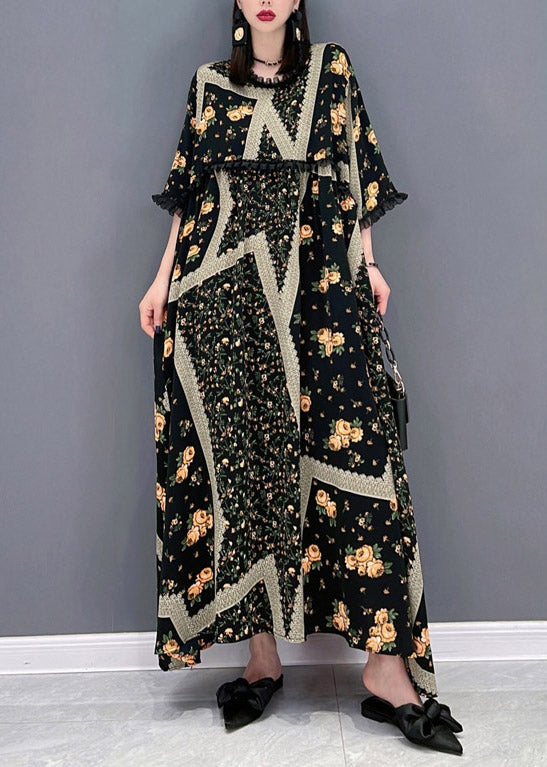 French O-Neck Print Ruffled Patchwork Beach Long Dresses Half Sleeve
