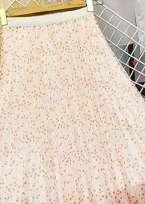 French Orange Elastic Waist Print Tulle Pleated Skirt Summer