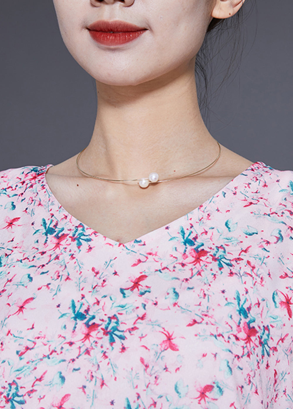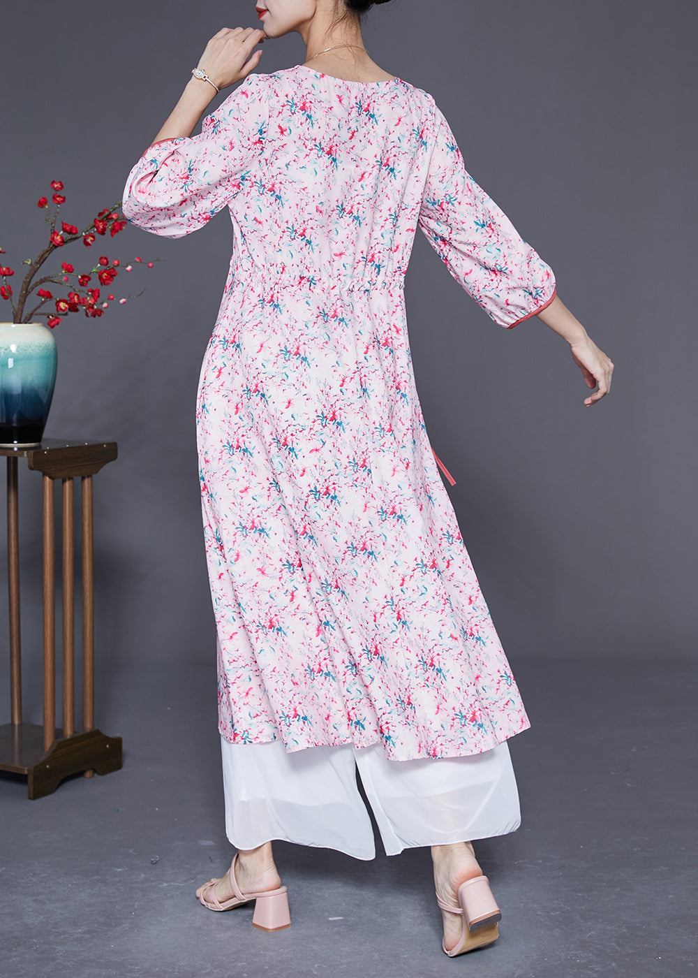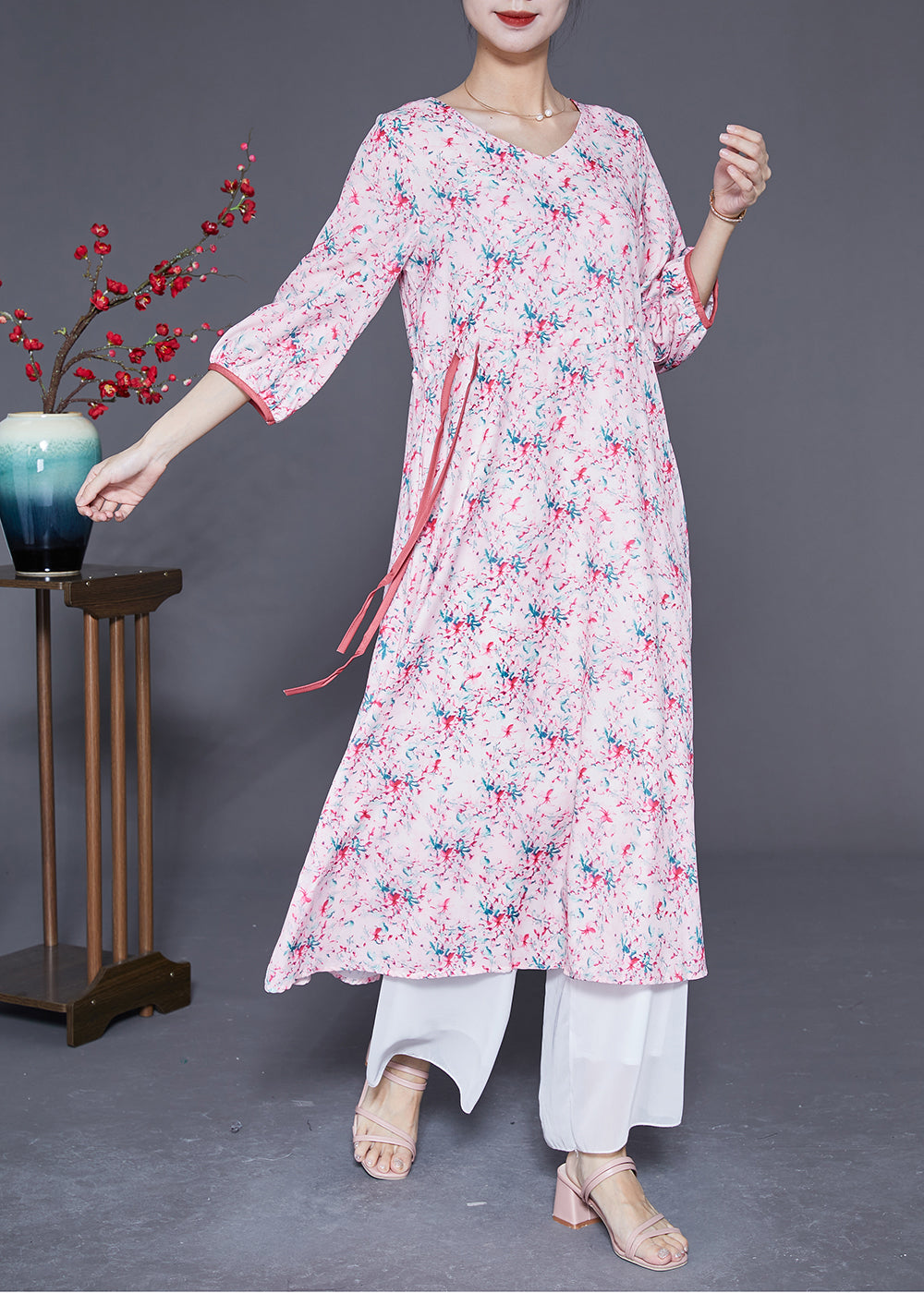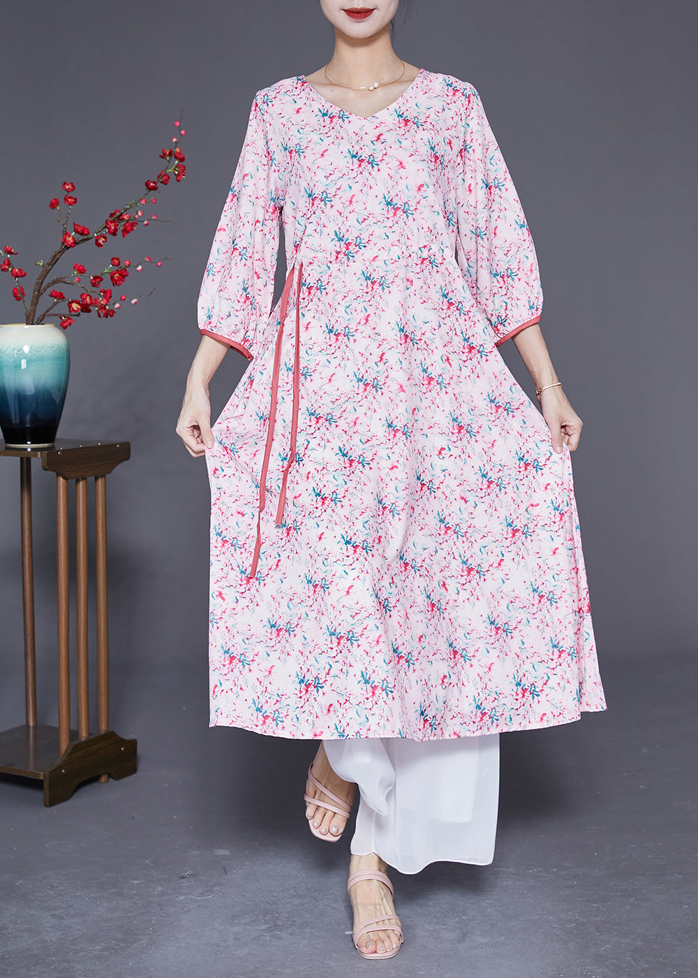 French Pink Print Tie Waist Silk Dress Bracelet Sleeve