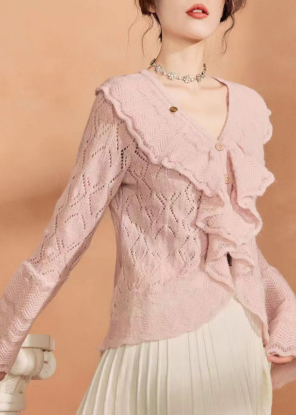 French Pink Ruffled Hollow Out Knit Sweaters Flare Sleeve