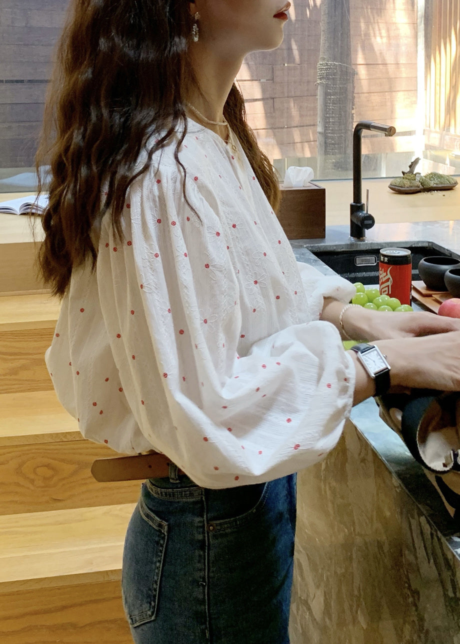 French White O-Neck Print Button Cotton Shirts Lantern Sleeve