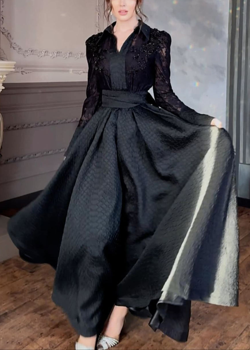 French White Peter Pan Collar Pearl Lace Long Dress Spring