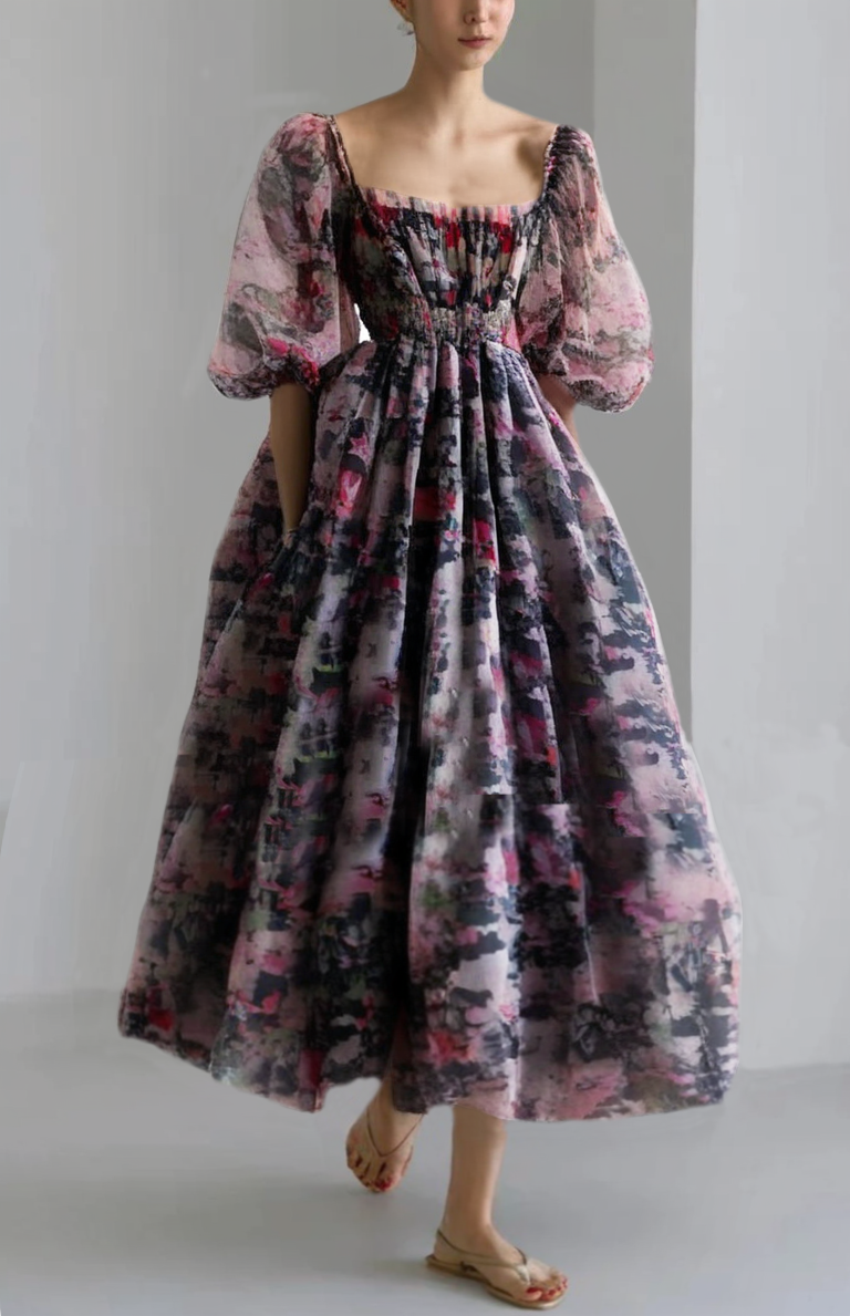 Grace Black Square Collar Print Tulle Patchwork Tunic Mid Dress Short Sleeve