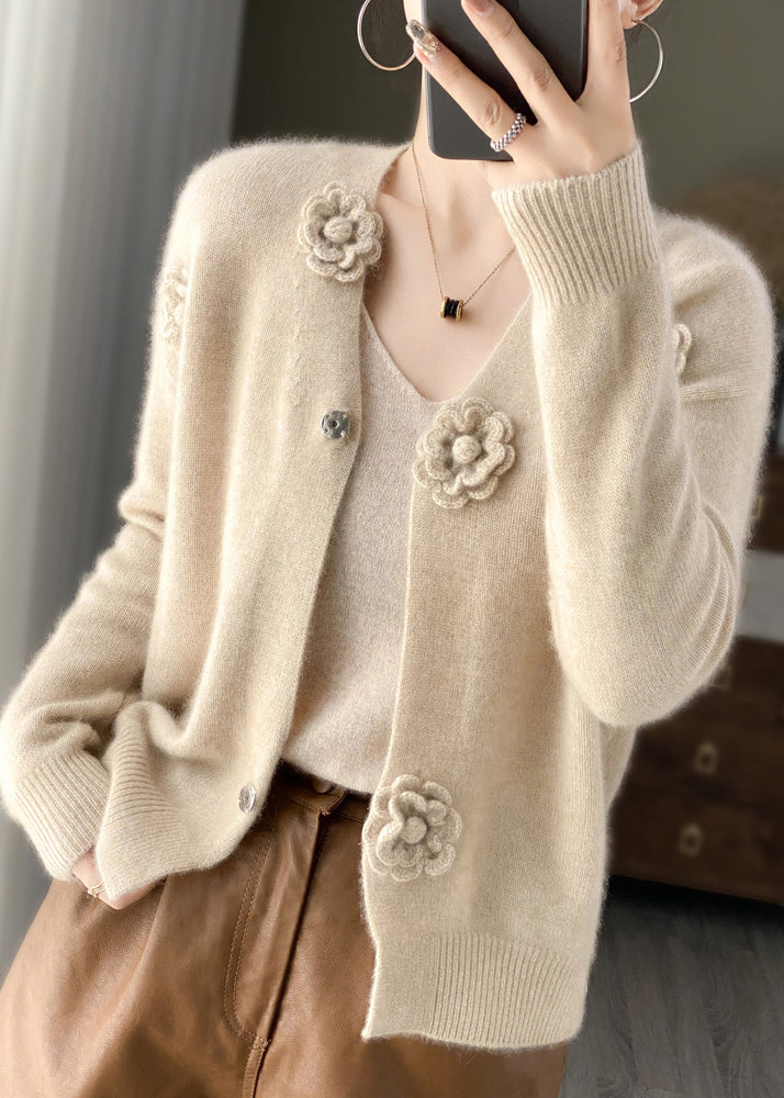 Handmade Beige V Neck Floral Crochet Cashmere Knit Cardigan Spring