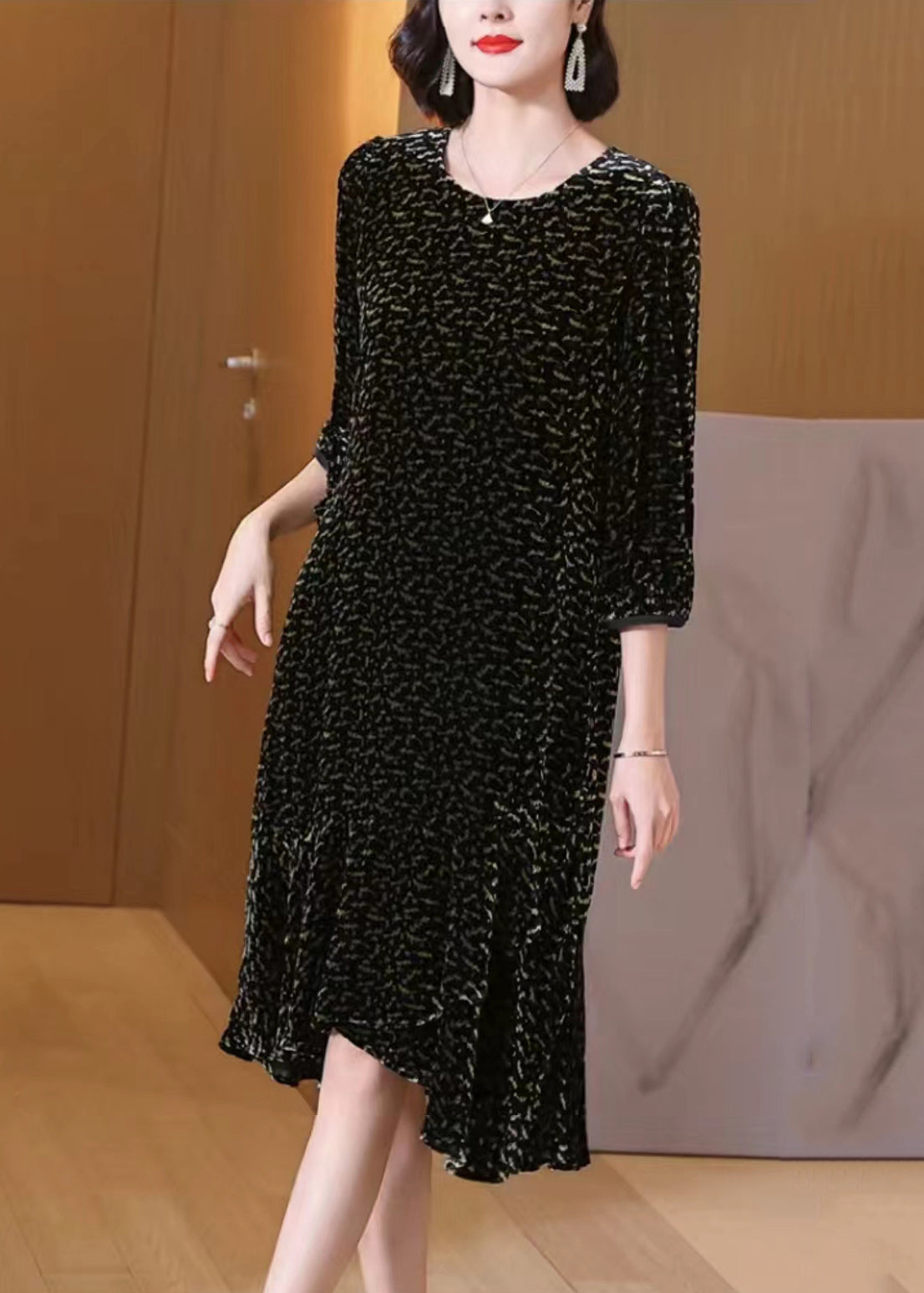 Italian Black O Neck Print Silk Velour Dress Bracelet Sleeve