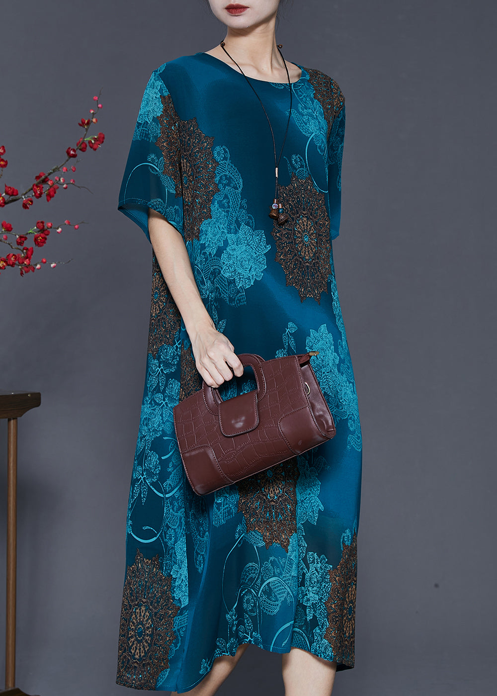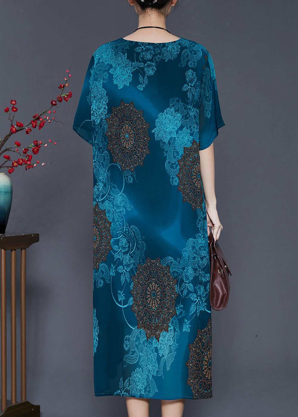 Italian Peacock Blue Oversized Print Chiffon Vacation Dresses Summer