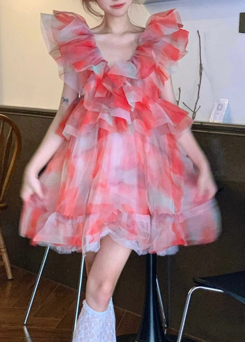 Italian Red V Neck Print Gradient Color Tulle Mini Beach Dress Short Sleeve