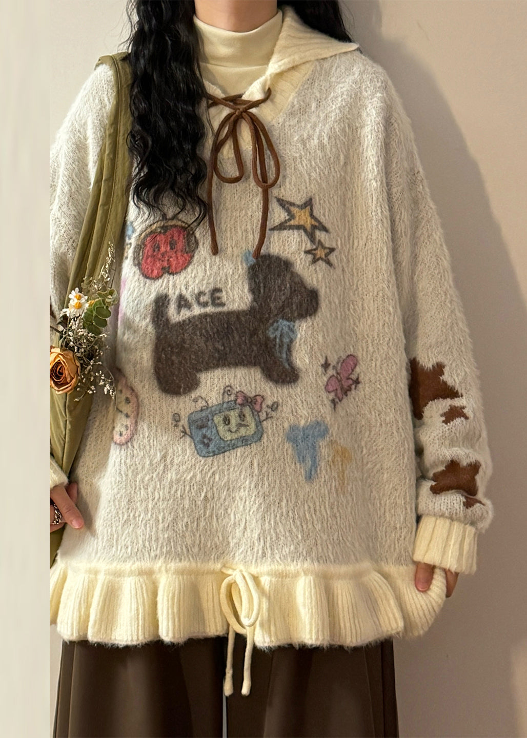 Jacquard Apricot Hooded Ruffled Lace Up Patchwork Knit Sweater Winter