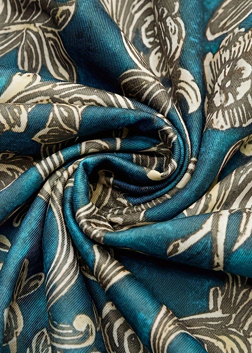Loose Blue V Neck Print Cotton Mid Dress Long Sleeve
