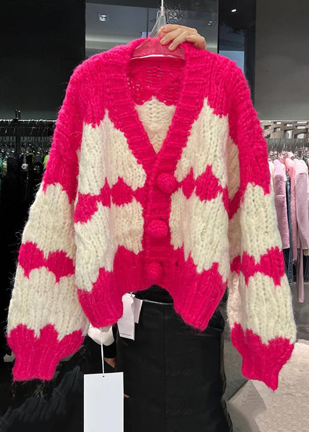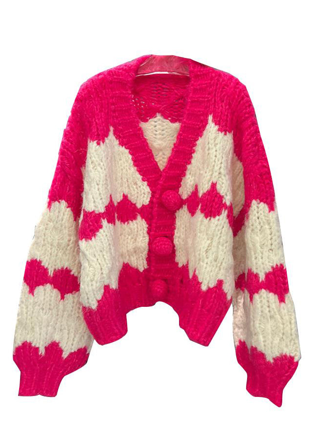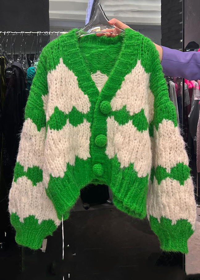 Loose Green V Neck Button Patchwork Cotton Knit Coats Fall
