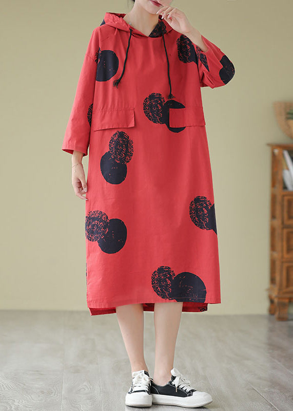 Loose Red Hooded Dot Print Cotton Dress Fall