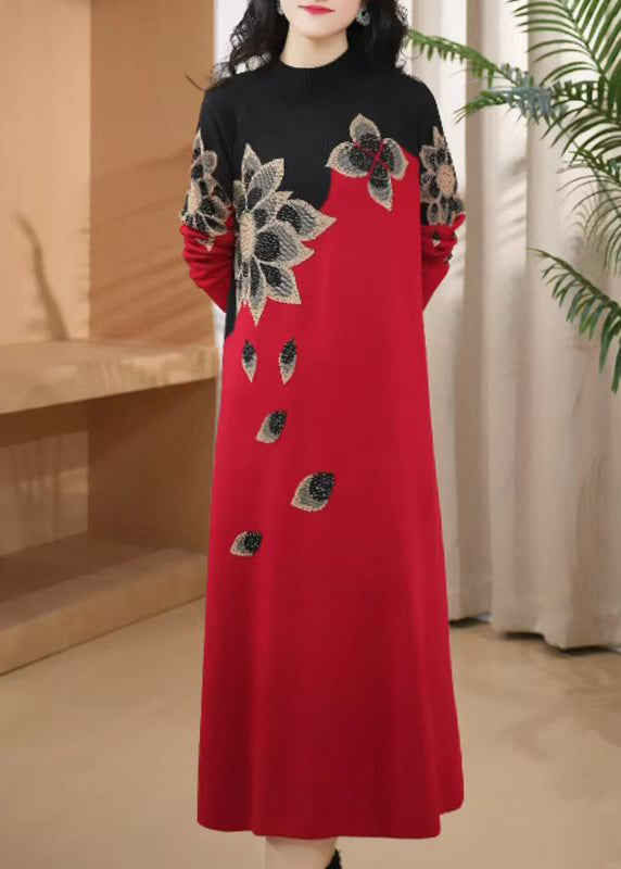 Loose Red Turtleneck Patchwork Knit Sweater Dress Winter