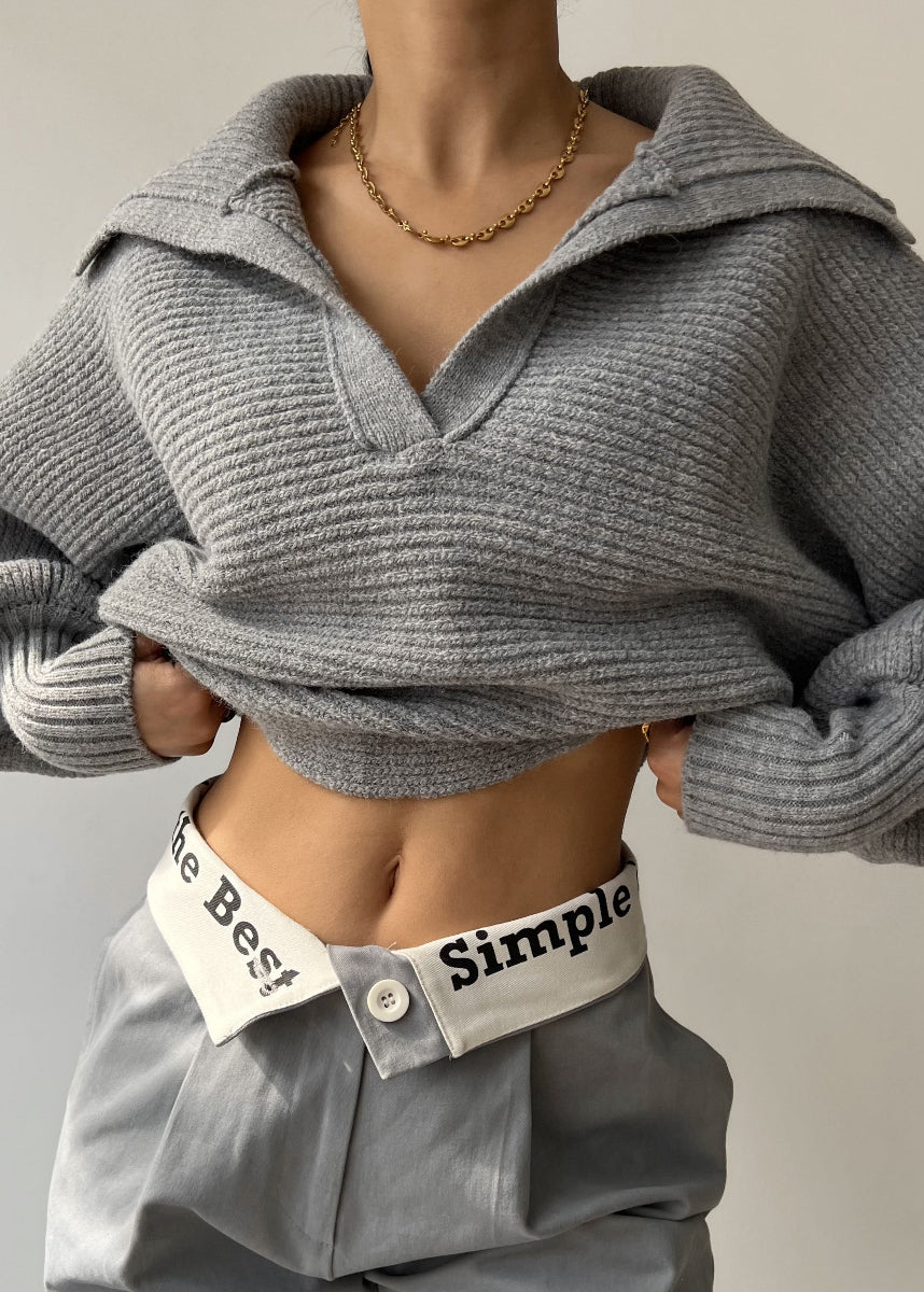 Natural Grey Peter Pan Collar Thick Cotton Knit Sweater Lantern Sleeve