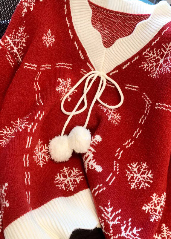 New Red V Neck Print Lace Up Cotton Knit Sweaters Spring