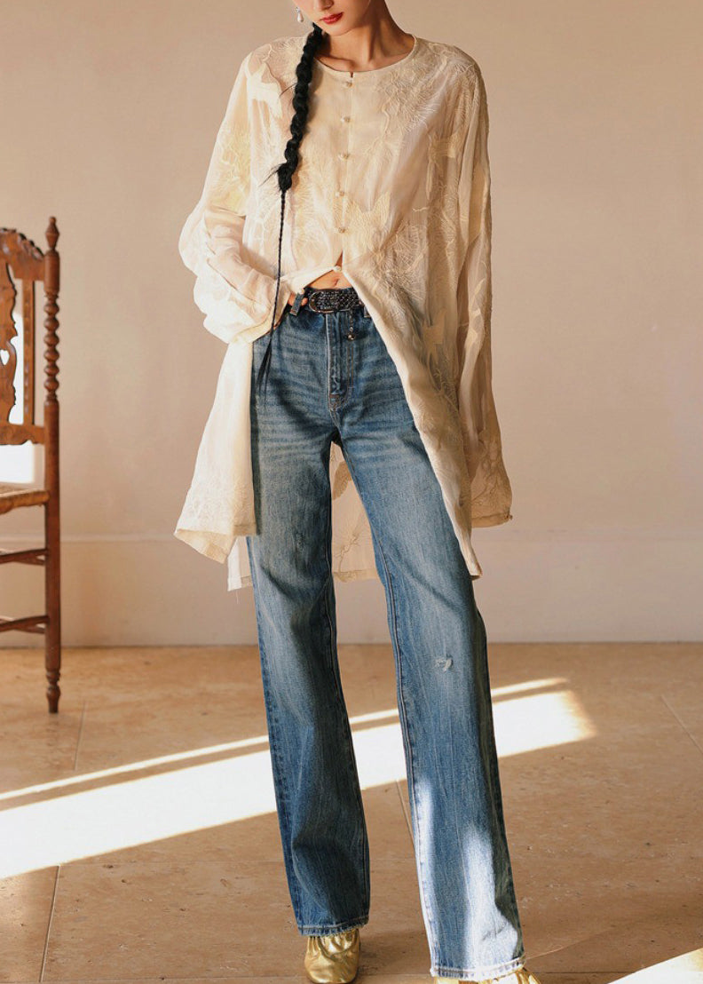 New Retro Beige Embroidered Shirts Dress Long Sleeve