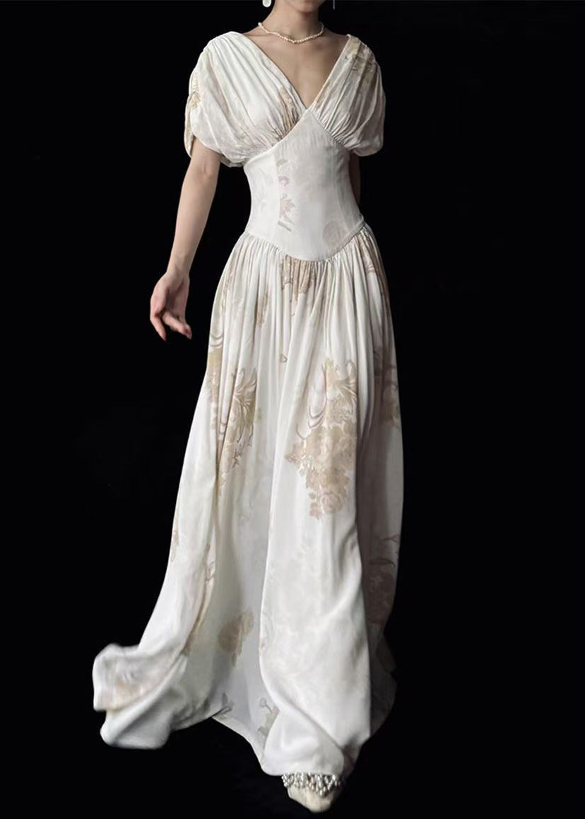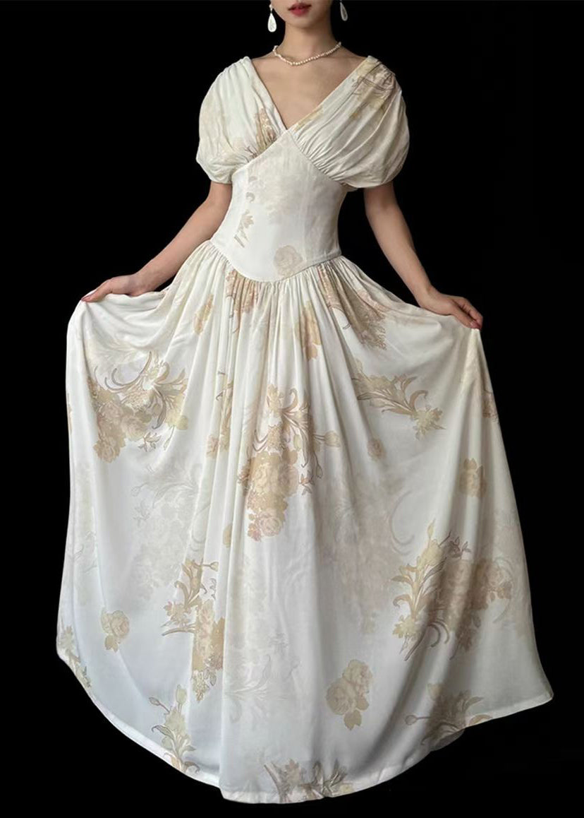 New White V Neck Print Pockets Cotton Maxi Dress Summer
