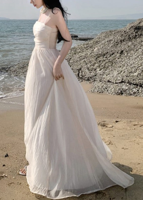 New White Wrinkled High Waist Patchwork Cotton Spaghetti Strap Dress Sleeveless