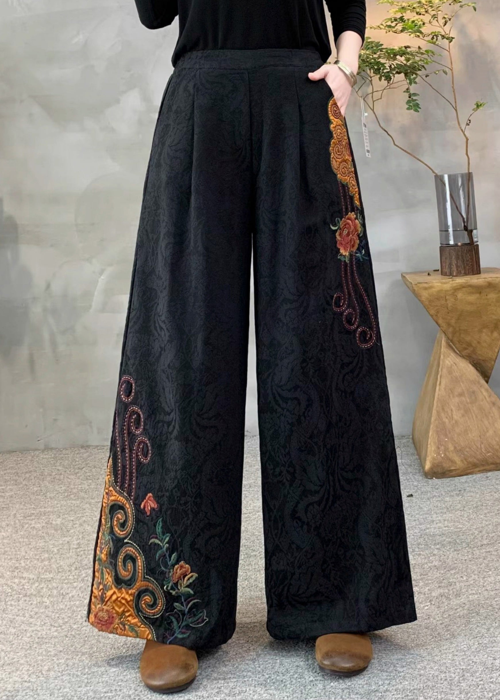 New Yellow Embroidered Pockets Warm Fleece Pants Winter