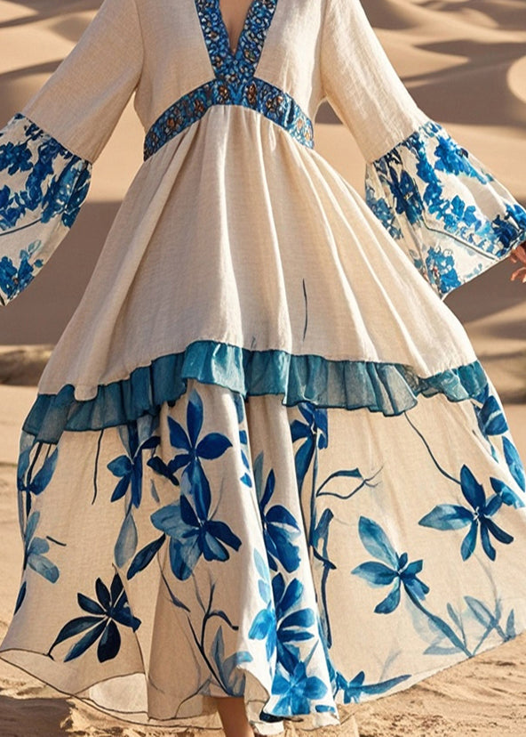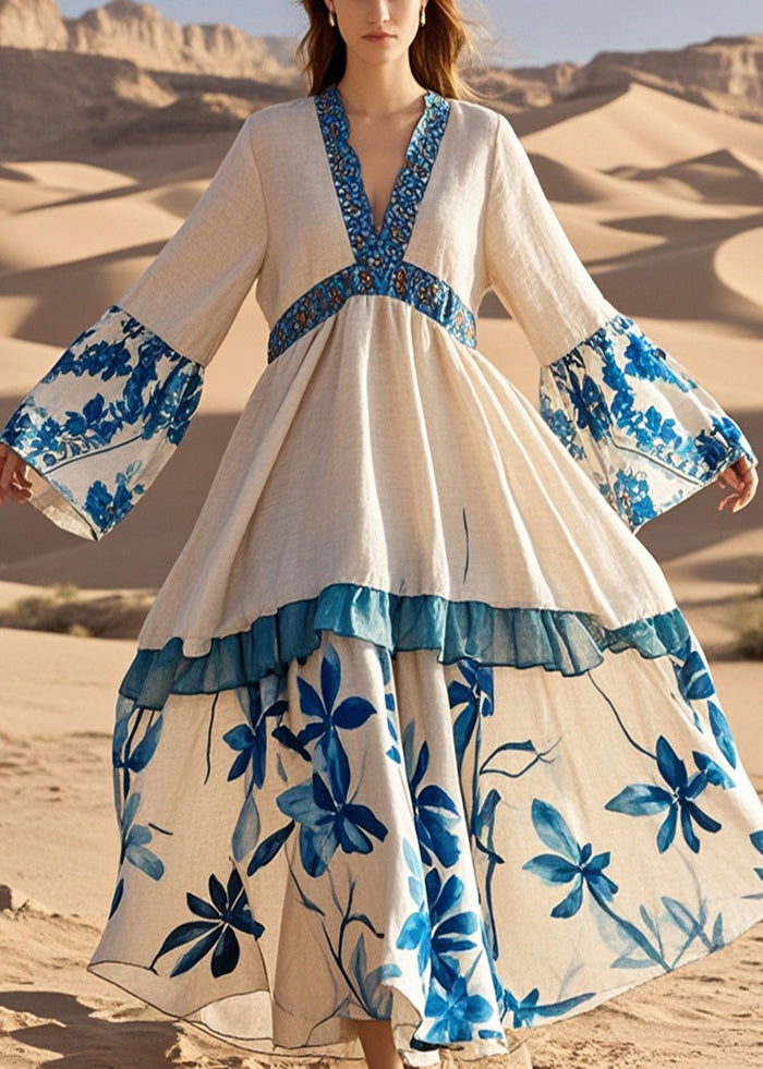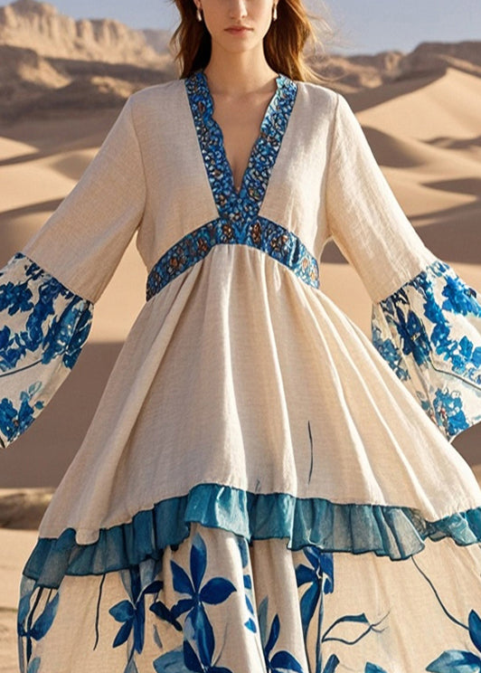Plus Size Apricot V Neck Patchwork Print Cotton Holiday Dress Spring