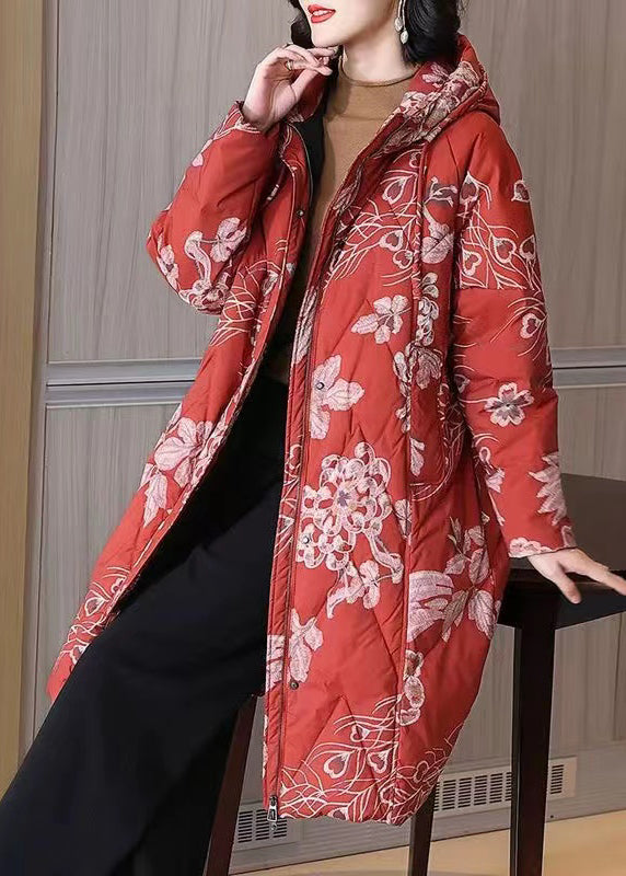 Plus Size Black Hooded Print Pockets Duck Down Down Coat Winter