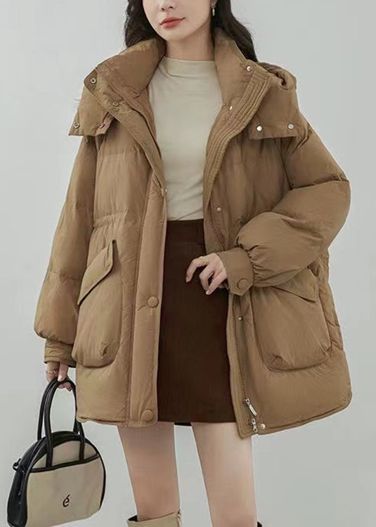 Plus Size Khaki Hooded Zip Up Pockets Duck Down Coats Winter