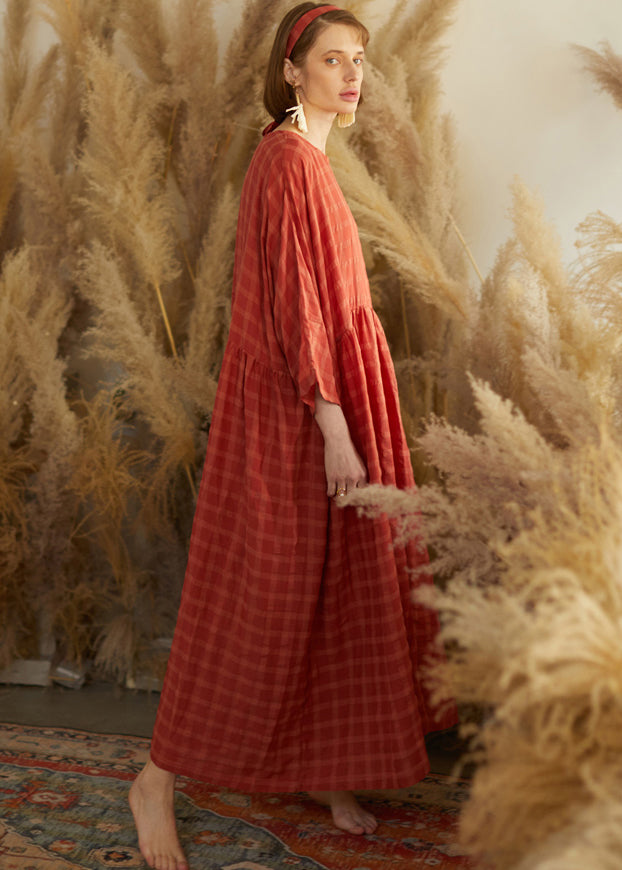Plus Size Orange O Neck Plaid Wrinkled Patchwork Cotton Maxi Dresses Fall