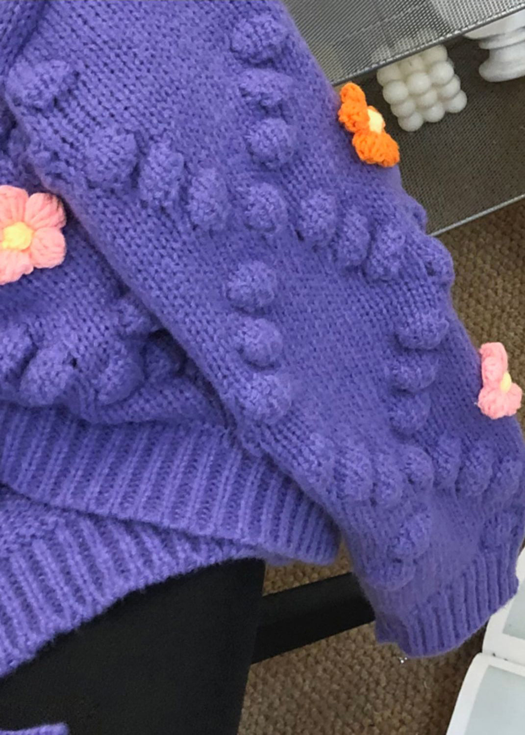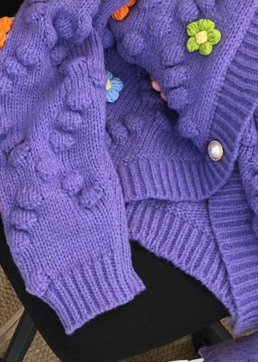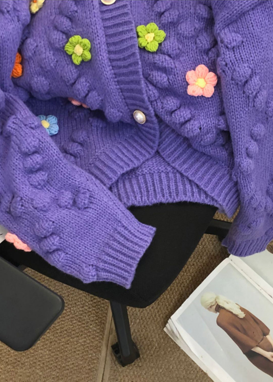 Purple Floral Patchwork Knit Cardigan O Neck Button Fall