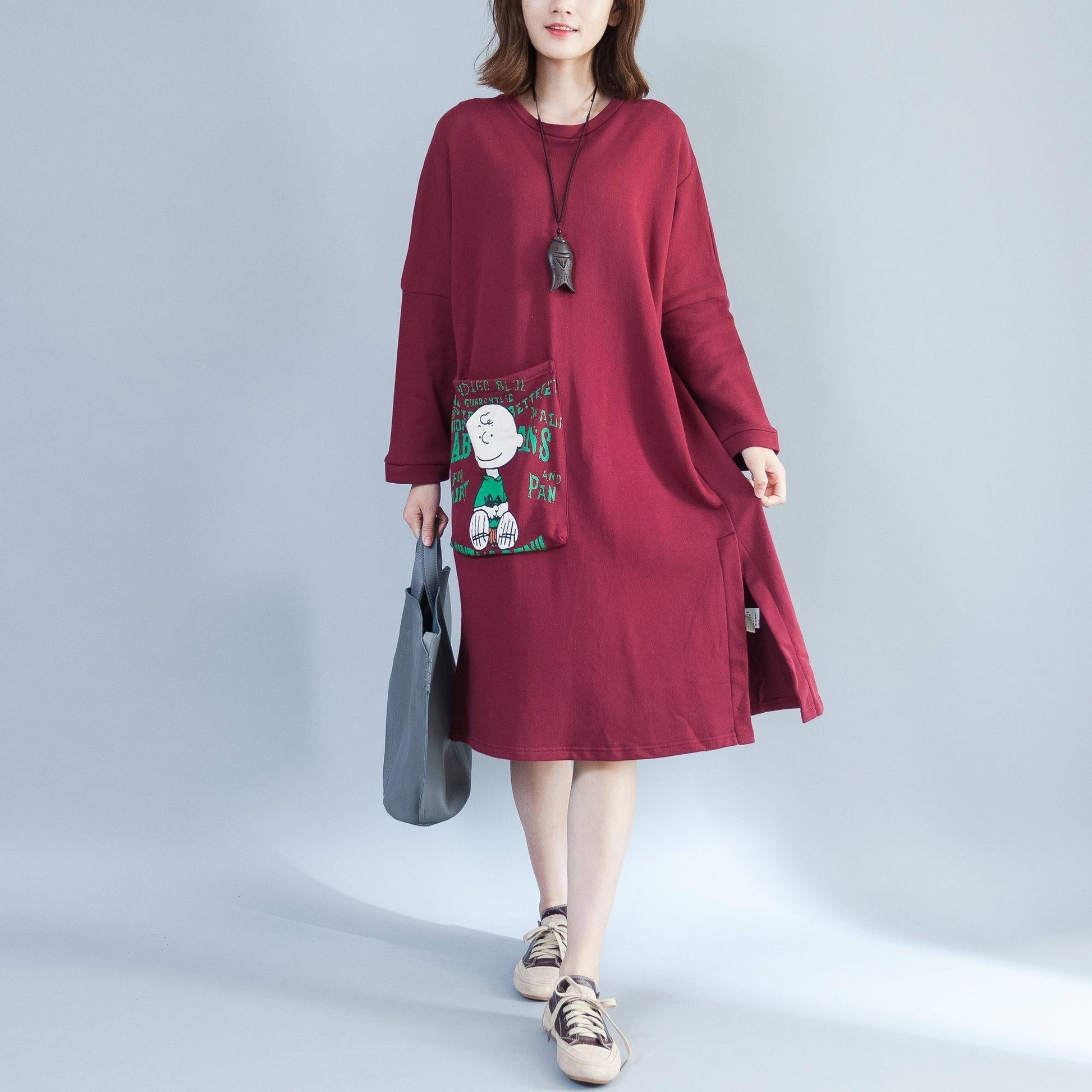 red fashion back prints cotton casual dresses plus size large pockets prints thick shift dress