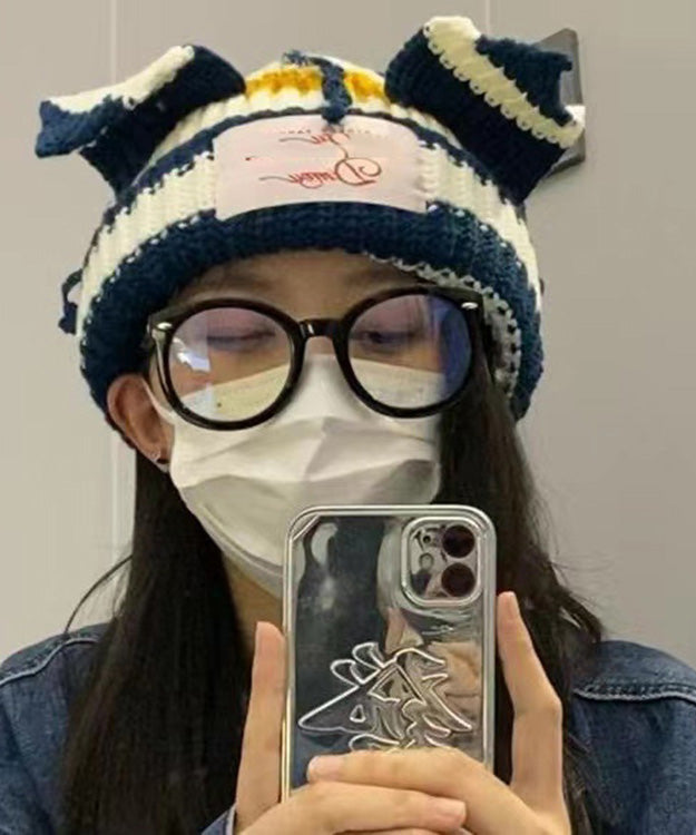 Retro Black White Striped Pig Ear Knit Bonnie Hat
