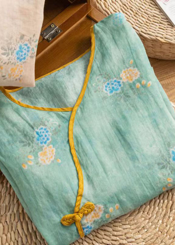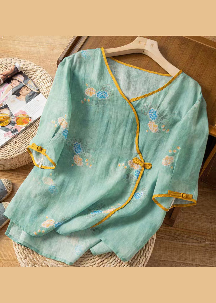 Retro Yellow V Neck Print Cotton T Shirts Top Summer