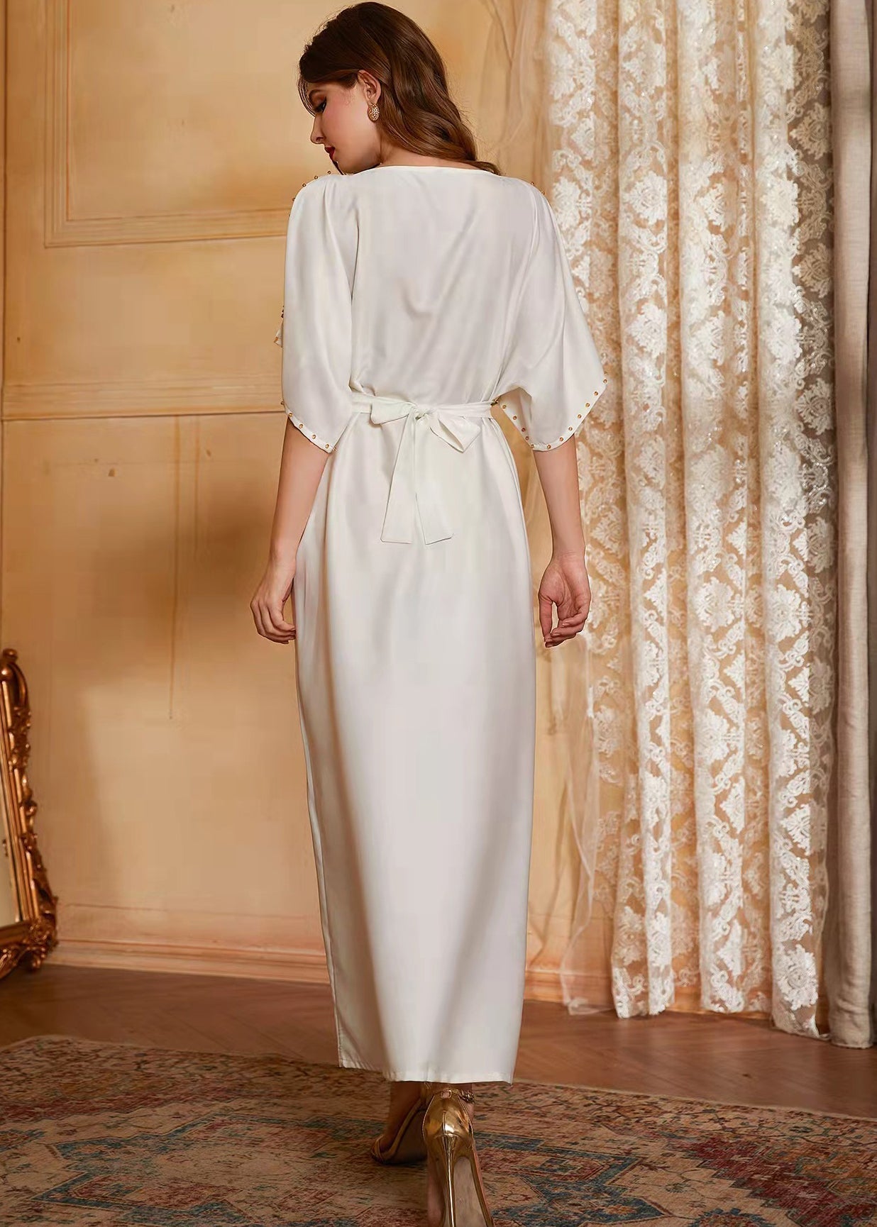 Sexy Blue O-Neck Patchwork Zircon Satin Maxi Dress Short Sleeve